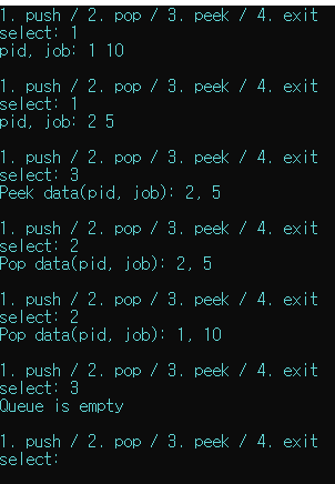 printf("Peek data(pid, job): %d, %d\n", p.pid, p.remainingJob);