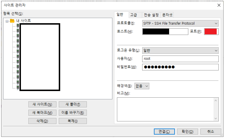 FileZilla의 사이트 관리자에서 SFTP 프로토콜 설정을 추가한다.