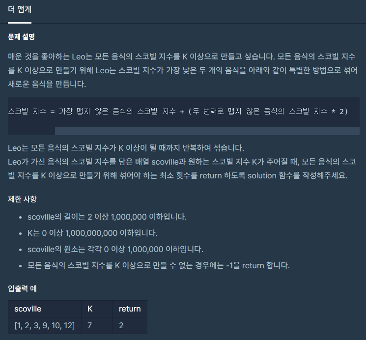 문제의 새로운 스코빌을 만드는 공식 대로 계산하여 다시 큐에 넣는 과정을 반복합니다.