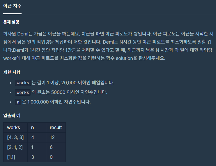 max heap을 이용하여 n과 works를 1씩 줄이면 답을 낼 수 있고, 효율성을 올리려면 가장 큰 work 와 두번째로 큰 work의 차이를 한번에 n에서 빼면 될 것 같습니다.