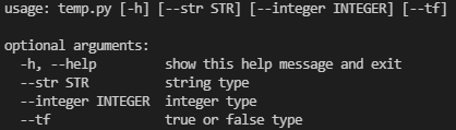 python temp.py -h 또는 python temp.py --help를 입력하면 따로 지정하지 않아도 기본으로 도움말을 얻을 수 있다.