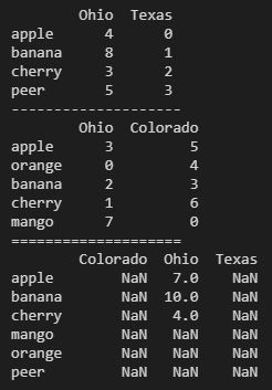 fruitFrame1 = DataFrame(fruitData1, columns=['Ohio', 'Texas'], index=['apple', 'banana', 'cherry', 'peer'])