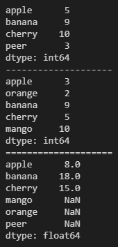 +, -, *, /, %, // (몫 연산) 모두 가능하며 겹치지 않는 인덱스의 value는 계산되지 않고 NaN으로 표기된다.