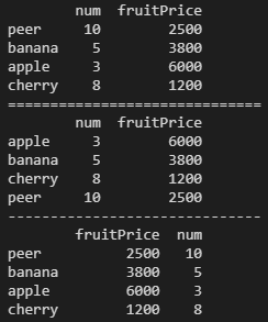 print(fruitFrame.sort_values(by=['fruitPrice', 'num'])) # price 같으면 다음 정렬 기준을 num으로