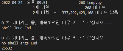subprocess 함수는 백그라운드로 실행되며 명령어를 호출 한 process의 pid를 얻거나 명령어가 완료될 때까지 기다릴 수 있다.