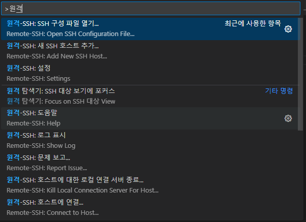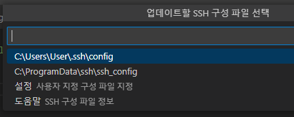 Ctrl + Shift + P 입력 시 명령어 창에 원격을 입력하고 원격-SSH: SSH 구성 파일 열기를 클릭한다.