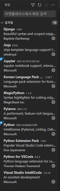 현재 설치된 확장 기능을 표시하고, 사용하고 싶은 확장 기능은 검색하여 설치하고 사용이 가능하다.